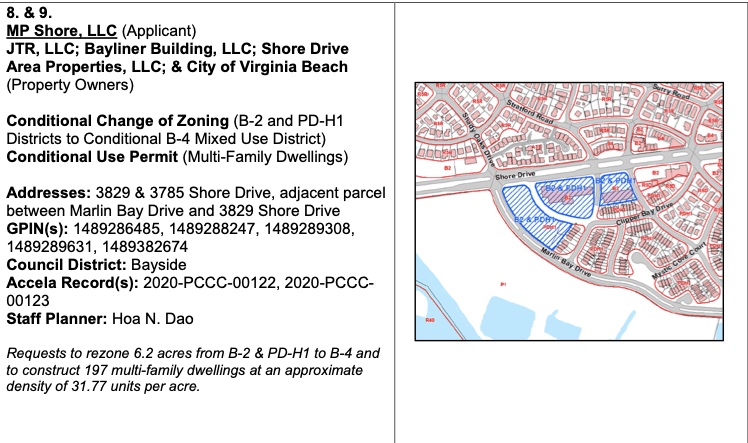 The Marlin Bay properties on Shore Dr. at Marlin Bay Dr. , which are next to the Pleasure House Point Nature Area, are owned by the Browning and McLeskey families. They wanted to develop these properties in tandem as one development. In 2020 a 227 unit apartment complex of 1, 2, and 3 bedroom units with a 4 1/2 story parking garage was proposed. The developers asked the city to approve rezoning and B4 conditional use so they could build this large development which cannot be built under its current zoning. The project includes using the acreage of the Lynnhaven Marina even though it will remain solely a boat sales business (under a long term lease from the McLeskey Co.) and will not be integrated into the project. Using this acreage in calculating the density yields the high density desired by the owners to reach their stated profit goal. The Bayfront Advisory Commission twice declined to recommend approval even after the design density was reduced to 197 units. The Planning Commission did vote to recommend City Council approval (see below) with three members dissenting. In October 2021 the application to build the complex was withdrawn by the owners. A super majority is required in a city council vote to sell city property which the project would need to acquire the streets that separate the parcels. After the withdrawal of the application, the civic league expressed willingness and commitment to collaboration with the owners/developer in the hopes of finding a project with broad support. In Feb. 2022 the civic league committee met with and engaged in a substantive dialogue with Mr. Peterson with that aim. No subsequent invitations to meet were received.