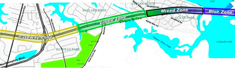 - In addition, although the project site is technically within the “mixed zone” for the Shore Drive Corridor, it sits on the dividing line with the “green zone”, Marlin Bay Drive. Page 3, Evaluation and Recommendation