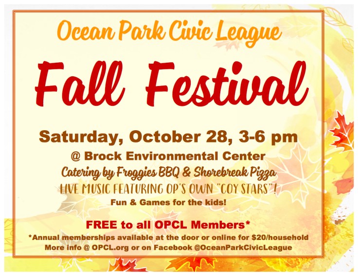 Join other OPCL Members for the free Fall Fest at Brock Oct 28th ! Join us! Not an OPCL Member yet?Click image to learn more! New to Ocean Park? Not quite a Member yet? Start here to learn more about OPCL Membership. Learn more about Brock Environmental Center at Pleasure House Point. Share this: Click to share on X (Opens in new window) X Click to share on Facebook (Opens in new window) Facebook Like Loading... Related Comments are closed.