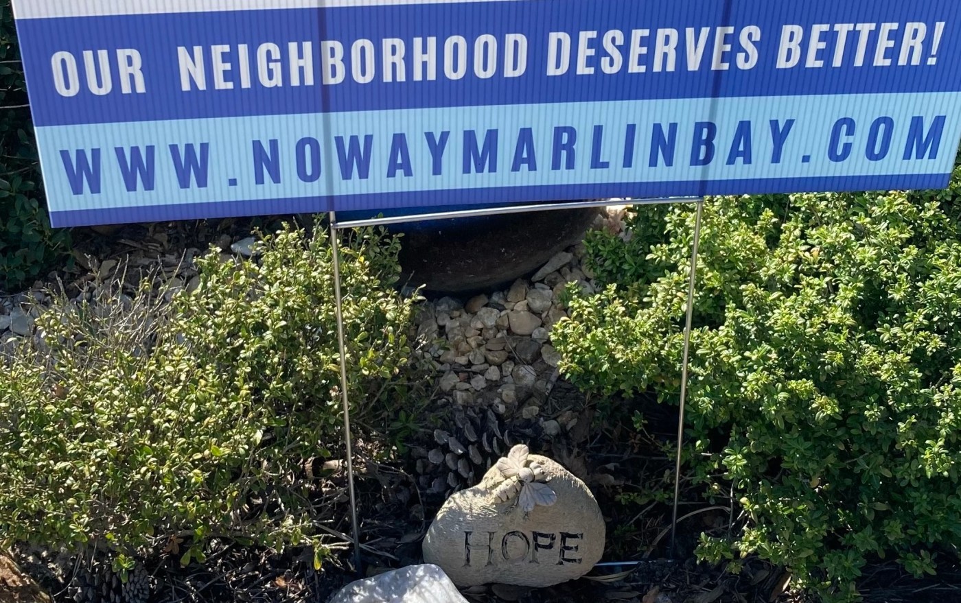 Hello, one of my neighbors passed on your info for a no way Marlin Bay sign . We strongly oppose the building of these apartments and would like to continue showing our support for the cause.