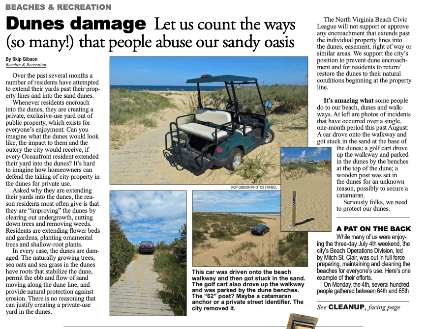 The North Virginia Beach Civic League has identified encroachment into the dunes as a problem in their October Newsletter and has taken the step of advocating the prevention of encroachment activities.