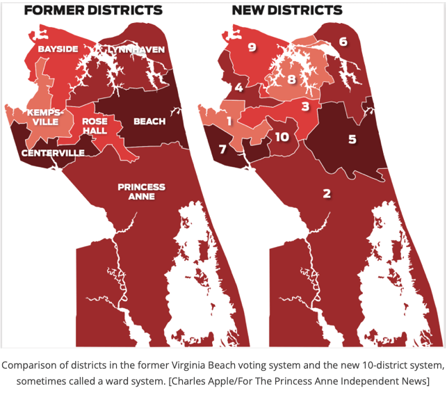 The city continues to solicit input from city voters on what the election in 2024 will look like in Virginia Beach: 10 districts with the mayor elected city wide or 7 districts and 3 at large seats with the mayor elected citywide. Everyone can give their input in the online survey until May 26th or leave a voicemail at any time: Election System Community Engagement:public input.