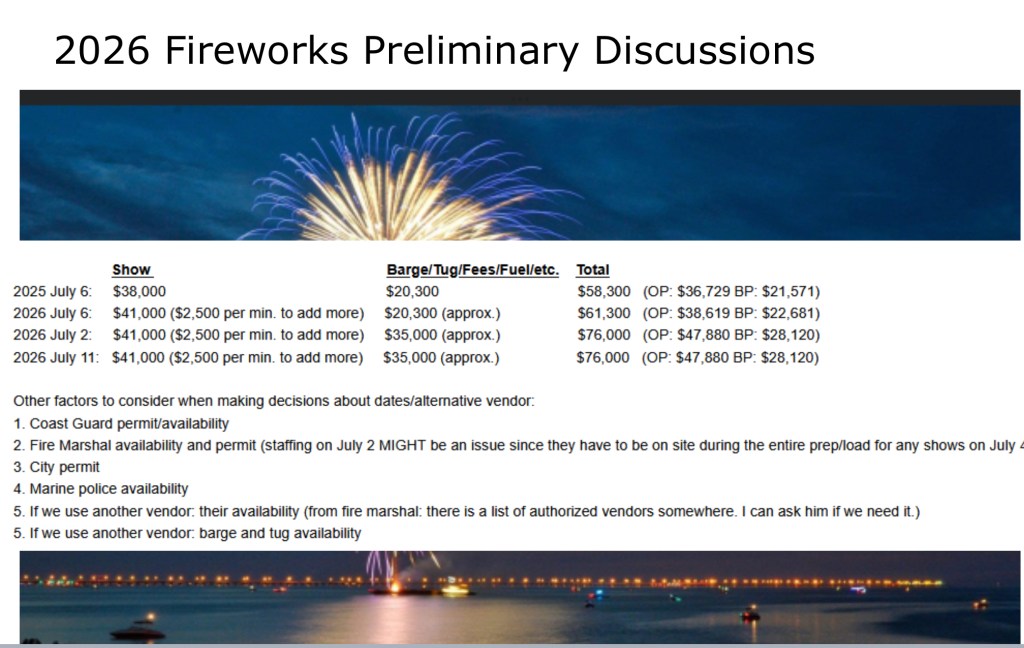 The meeting also included some food for thought about 2026 Fireworks date which will have to take into account many factors especially cost. Jill Doczi, Fireworks Chair, gave an update. Sharing a barge and staffing with the city brings those costs down but limits choices. There are many hoops to jump through: City of Virginia Beach Fire Marshal, Homeland Security, U.S. Coast Guard etc. all must approve and issue permits.