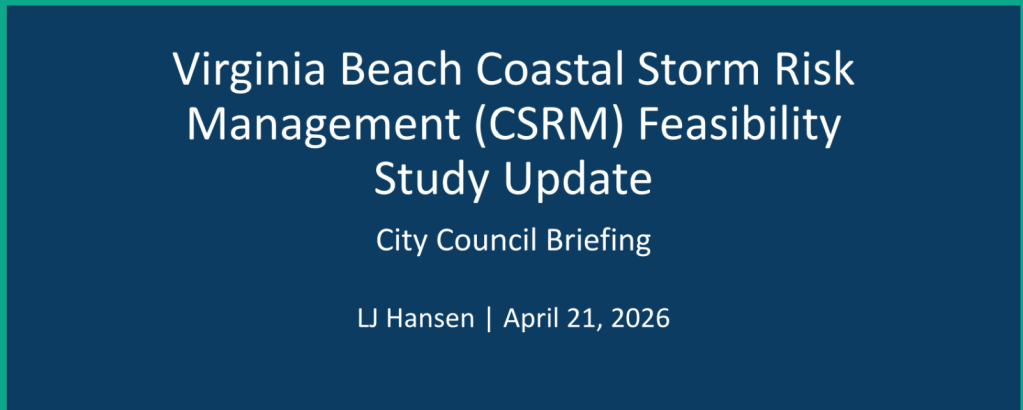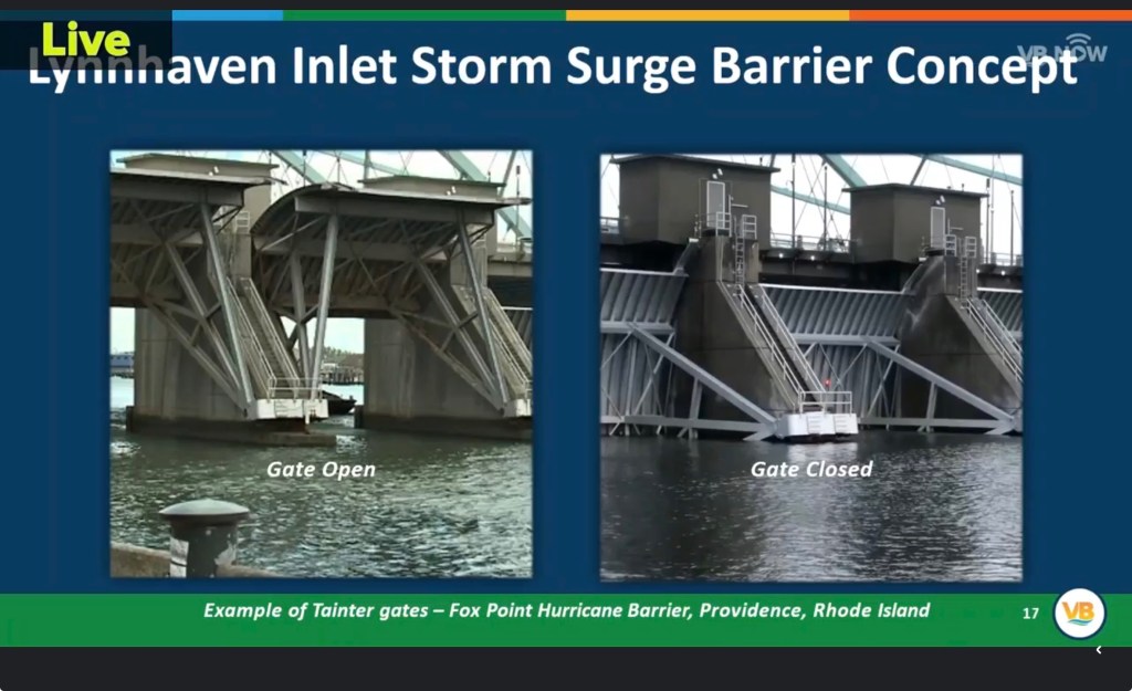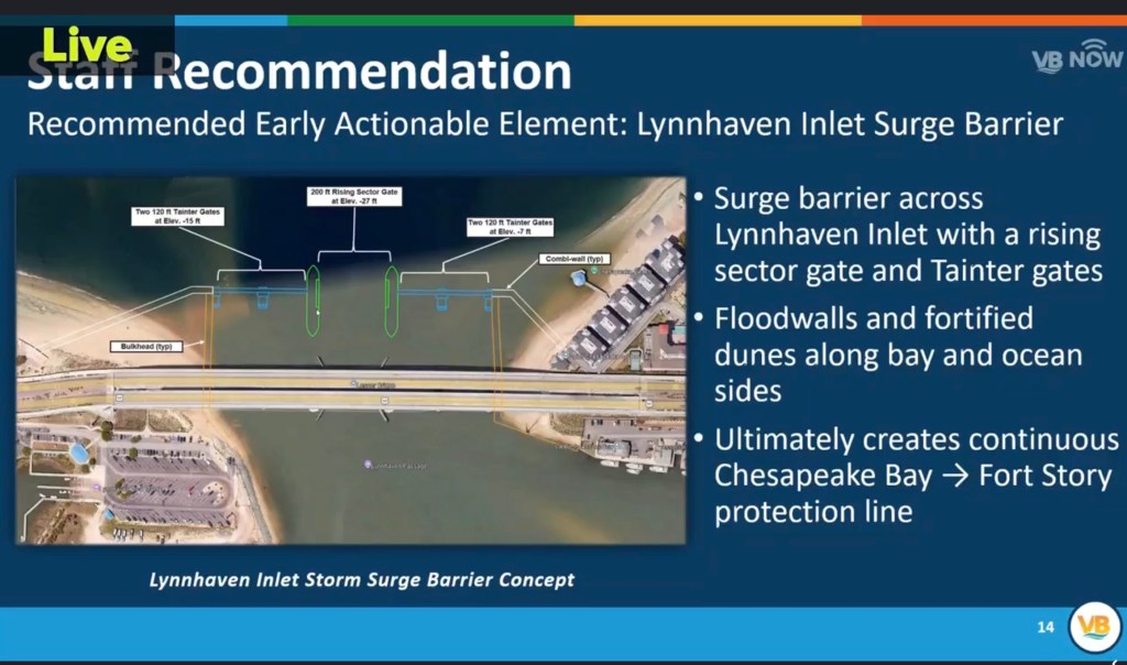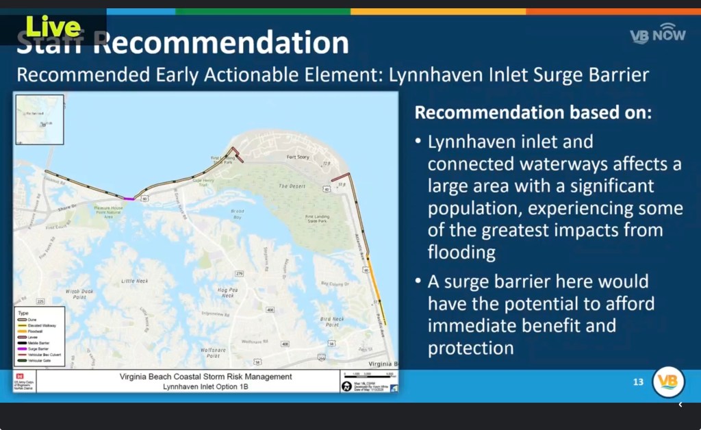 US Army Corp of Engineers has engaged in a long range study of the feasibility of managing the storm risks associated with sea level rise in our area with any actual steps being fairly far in the future. Of the many possible projects under study, the Lynnhaven Surge Barrier has been identified by the USACE as the Early Actionable Element. Much more information to come and wider public engagement has been promised.