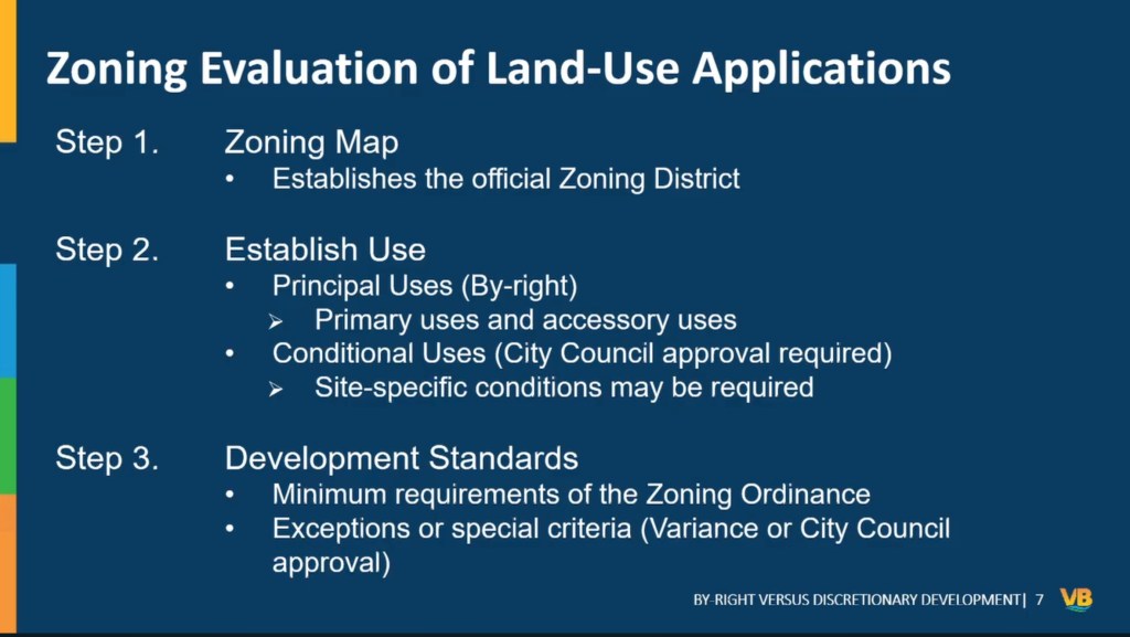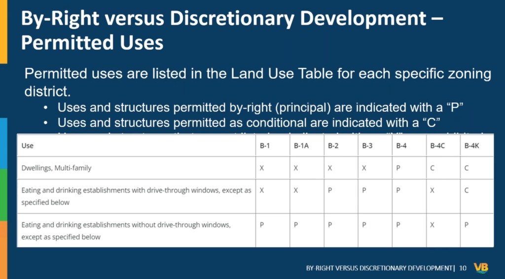 What can be built in Virginia Beach ‘by right‘ -that is without any public input- and what development requires public hearing? Here is a quick and easy to understand presentation: By Right and Discretionary Zoning: that was recently briefed to the City Council by Kevin Kemp , Zoning Administrator and Kathy Warren, Planning Director (begins at minute 49). The discussion that follows by city council members is also interesting and an overhaul of the zoning code is mentioned to be undertaken (last done 1988 during a time of rapid growth). Councilwoman Barbara Henley’s remarks on B4 zoning origins and why it was used so much is very interesting.