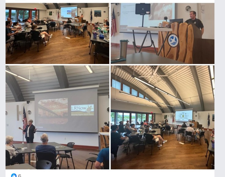 We learned a lot about the work of Lynnhaven River Now. from Karen Forget, Executive Director. While their work has a lot in common with the Chesapeake Bay Foundation, they are solely focused on restoring Virginia Beach waters. In 2002 when they were founded, no oysters or fish could be eaten from the Lynnhaven due to bacteria levels. The change today is huge. Karen talked about what LRN offers to homeowners and neighborhoods to safeguard and enhance the waters we all enjoy.