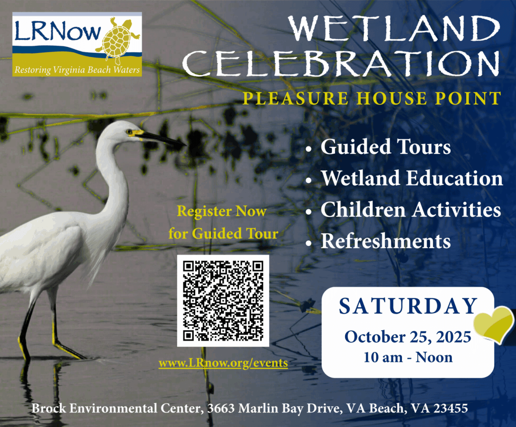 Learn about the Wetlands Restoration at Pleasure House Point from 10 am to noon! Sign up for a tour! Lynnhaven River Now has added another tour for Saturday, October 26th!