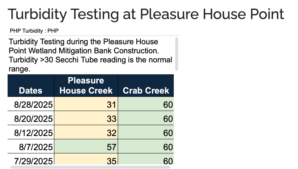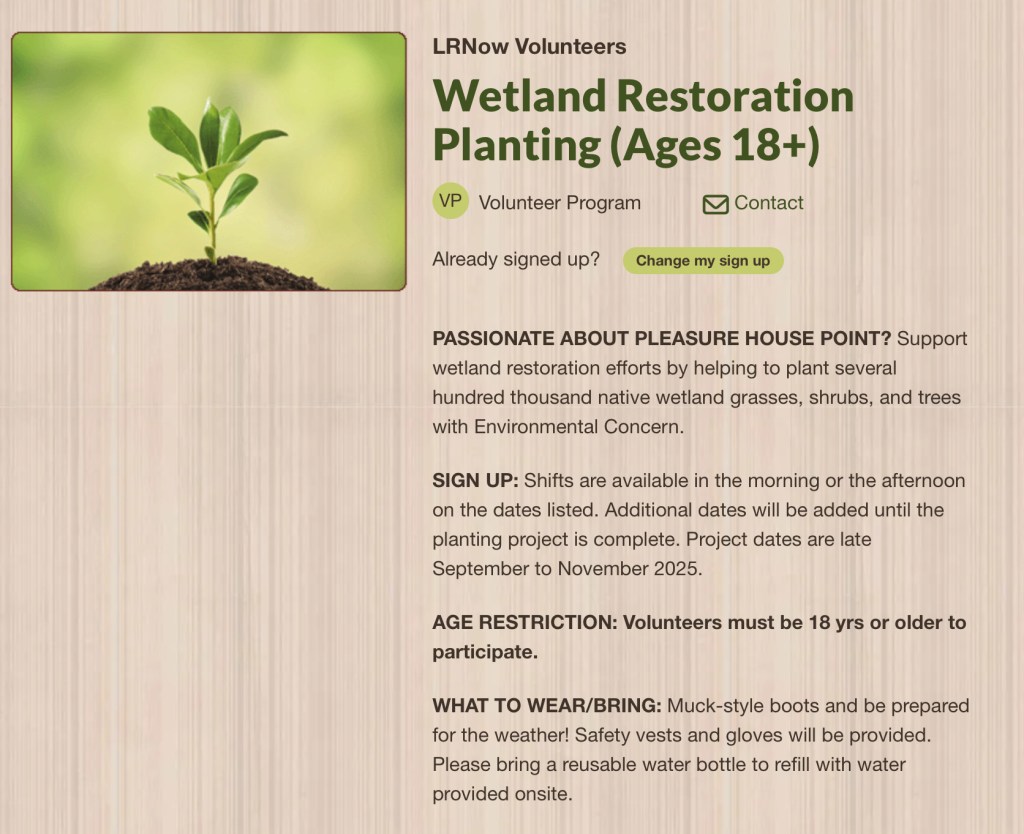 Separate from the COVB Wetlands Project at Pleasure House Point is the wetlands restoration project by the Army Corps of Engineers which has been in progress for 10 years. The 3rd phase will restore 6.6 acres at the southern tip of Pleasure House Point on Crab Creek.