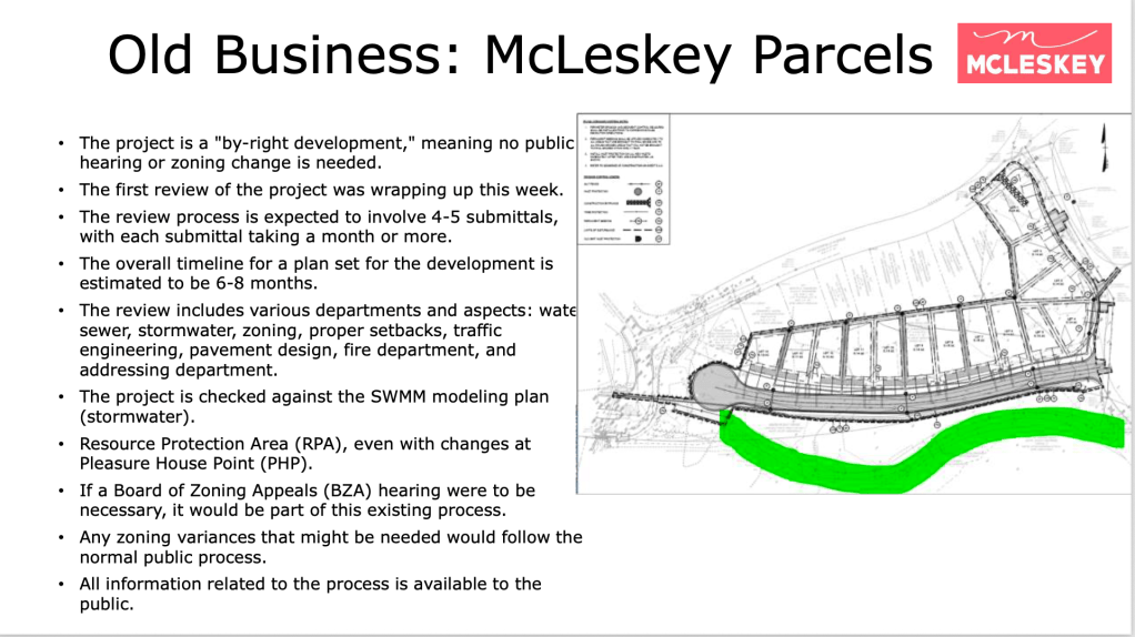 At the August 7 Ocean Park Civic League Meeting, President Danny Murphy shared the latest update on the proposed subdivision development within our neighborhood. The Marlin Bay Extension (different from the Marlin Bay multistory building project on Shore Drive- nothing new on that) is currently under review by the Planning Department. The project includes 26 units- 12 duplexes and 2 single family houses located near Pleasure House Point. The project is in the early stages of review and we will continue to monitor it and provide updates. President Danny Murphy secured an assurance from the Planning Department that as the project progresses, staff will be open to attending a civic league meeting to present.