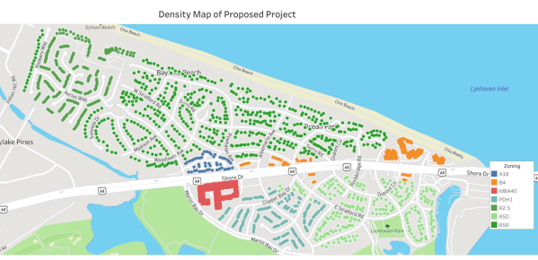 They say: “The Comprehensive Plan/Shore Drive Design Guidelines are met.” The developer has consistently been selective in citing from the Comprehensive Plan. They say that the project complies with the Comprehensive Plan and Shore Drive Design Guidelines since it is “mindful of land use compatibility” because it has less retail than is currently on the site. What gets left out of their talking points: “Infill development on small vacant parcels within an existing neighborhood or on parcels being redeveloped should be compatible to the existing development around it.” The existing development is townhouses and single family homes. This project has a stated density of 31.77 units per acre. This is more than double anything built anywhere nearby. Recent projects in Ocean Park have been 14 units per acre. This is NOT lowest reasonable density called for in the Comprehensive Plan that is supposed to guide city decision making. In fact the effective density is 40 units per acre since the actual acreage being developed is not 6.2 acres but 4.88 acres.