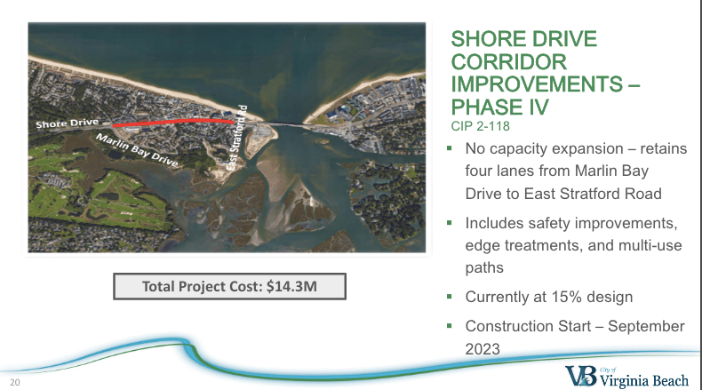 “Yes, the CIP info on the vbgov.com website is a bit dated. Shore Dr Ph 4 is currently in design. It was restarted recently after being paused for several years. The design is being performed concurrently with the Ocean Park Stormwater Master Plan, which will identify stormwater improvements required for the new roadway infrastructure (and to address current drainage issues). The Preliminary Engineering Report and 30% Plans for Shore Dr Ph4 are scheduled to be complete Aug 2023.”