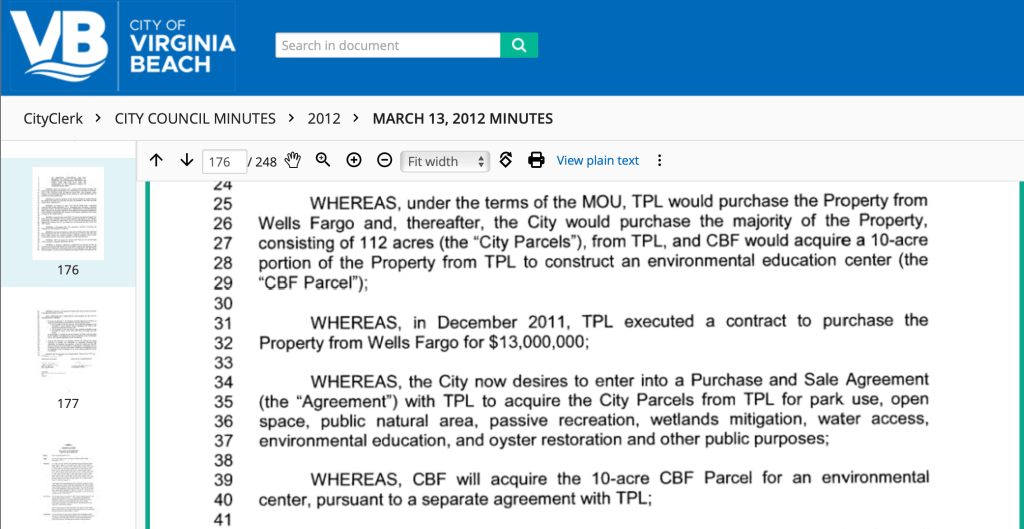 In 2012 the City of Virginia partnered with the Trust for Public Land and the Chesapeake Bay Foundation to purchase the land that is now Pleasure House Point Nature Area. The City Council Resolution of March 13, 2013 lays out the planned uses of the area to include wetland mitigation. ( Complete Document resolution starts on page 176).